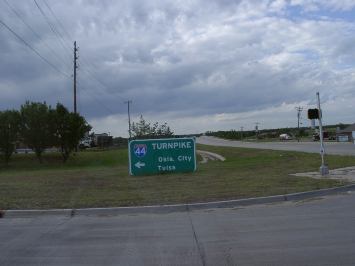 | Fallen guide sign for I-44/Turner Turnpike on OK 99; Stroud. | Jeff Kitsko; May 23, 2001 |