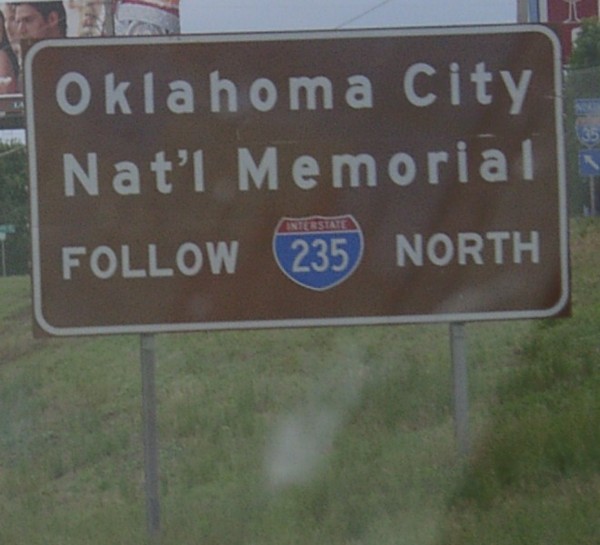 | Guide sign for Oklahoma City Bombing Memorial on I-35 North; Oklahoma City. | Jeff Kitsko; May 31, 2001 |