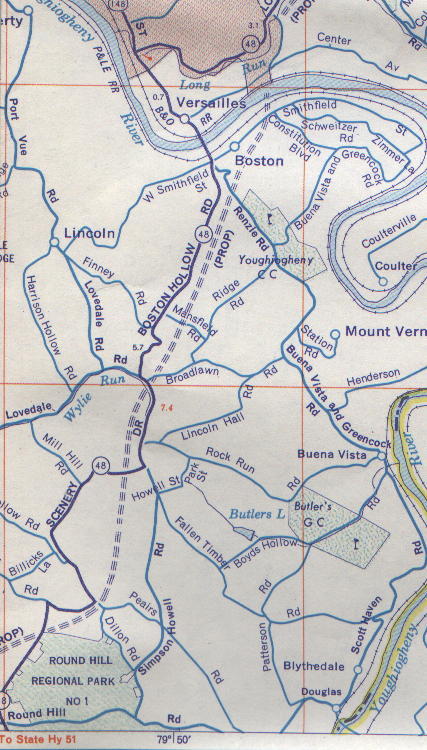 According to Matt Boyko of White Oak, there are many Right-of-Way acquisition remnants of the New 48. On Center Street in South Versailles and on the east side of current PA 48 are where many of these remnants can be found. Up the decent on Center St. after you turn on if from PA 48 look for a set of steps to your right that lead to no house. A house or two was relocated from here. Proceed along the main road. Now comes another thing to look for. Be on the lookout for the Peoples Gas complex on the left. On the other side of the road are of course about five sets of gas pipeline right of ways. In some of the cleared out areas in and among the pipelines was once a small farm and a house. I believe that this property was acquired by the state. The right of way of New 48 would have ran most likely through here and along the base of the large hill.