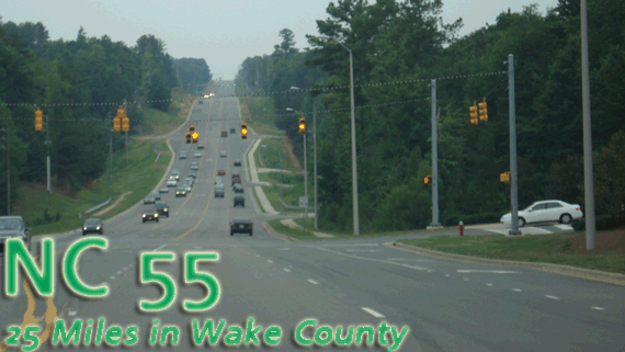 55 is western Wake County's Main Street. A widening project from US 64 all the way north into Durham County was finally completed early in 2007, with a first-of-its-kind funding process to pay for the widening through west Cary: the town actually paid for the widening up front, with the state reimbursing the town from the Transportation Improvement Plan as money became available (when it was originally planned to be spent). That's how badly this road needed extra lanes; even four lanes isn't enough. While 55 is a lot better now than it was when it was a two-lane road into RTP, it can still be a very slow ride at rush hour.