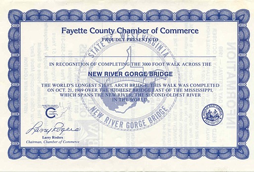 "Bridge Day" is a celebration of the bridge and also of the recreational opportunities the New River has to offer. The event, first held in 1980, features bridge jumping, rappelling, a carnival atmosphere, and more. The festival is West Virginia's largest one-day event. For More Information visit the New River Convention and Visitor's Bureau's Bridge Day Site. The festival is held the third Saturday of every October. Barb and John Bee were kind enough to share scans of a certificate they received for participating in the Bridge Day festivities in 1989.